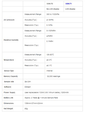 SSN-71 air pressure, humidity and temperature data logger measures and stores up to 32000 air pressure (300~1100hPa), temperature (-35 to 80℃(-31~176℉) and humidity (0 to 100%RH) readings. Logger status, alarm indication and low battery indication are via flashing red/green LED and yellow LED. The button on housing can be used to start logging, or confirm and clear LED alarm when LED alarm is hold status. Software can run under Windows XP, Vista, 7 or 8(32 bit and 64 bit Versions). User can easily use DGraph software to setup sample rate (from 2 seconds to 24 hours), high/low alarm limit and start/stop method, and download data to PC, etc. And then user can view, analyze and print the data, or export other file formats (txt, xsl, csv, bmp, jpg).