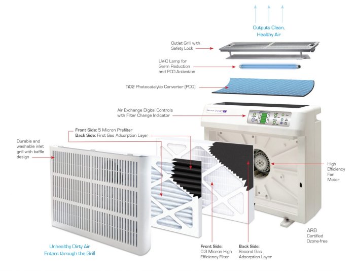 Powered by UV-C, PCO and Multi-stage Filtration Technologies: 99% elimination of viruses proven in independent laboratory testing; 93%+ elimination of bacteria; 99%+ elimination of air particulates and contaminants; 90%+ reduction of TVOCs; Safe for use in occupied settings: does not produce ozone or any harmful contaminants.