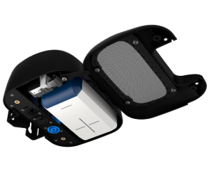 It features an ingenious opening and attachment system that allows you to easily slide the device onto the mounting plate and hold its protective case open in a single motion.