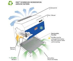 DWS Downflow Workstations maintain a constant face velocity of 80FPM at the work surface in compliance with USA and international standards for safety and performance. Contaminated air is pulled through the Multiplex filtration system where activated carbon adsorbs chemical vapors and/or particulates if HEPA/ULPA filters are used. Clean air is returned to the room.