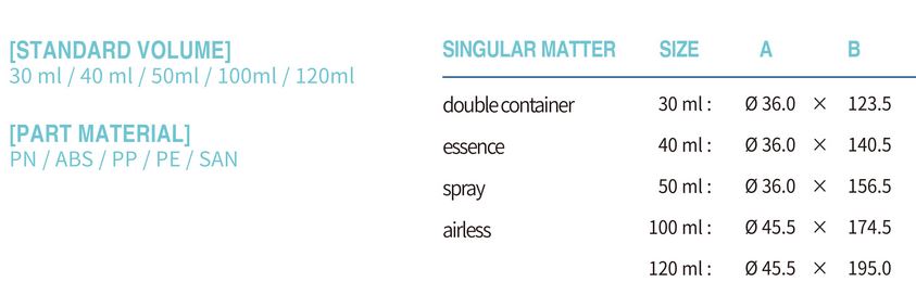 STANDARD VOLUME: 10, 15, 20, 30, 35, 40, 50, 60, 80, 100, 120ml. PART MATERIAL: PP/ PE. PP Single Container30ml : Ø31.5 x 117.4. Air Sense Pump Application40ml : Ø31.5 x 136.0. Apply spray pump. Airless (disk type).
