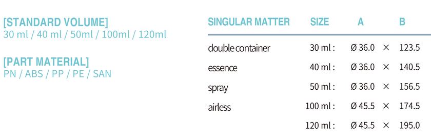 STANDARD VOLUME: 10, 15, 20, 30, 35, 40, 50, 60, 80, 100, 120ml. PART MATERIAL: PP/ PE. PP Single Container30ml : Ø31.5 x 117.4. Air Sense Pump Application40ml : Ø31.5 x 136.0. Apply spray pump. Airless (disk type).