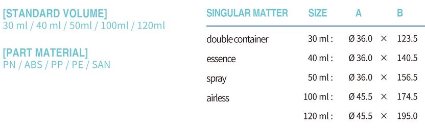 STANDARD VOLUME: 10, 15, 20, 30, 35, 40, 50, 60, 80, 100, 120ml. PART MATERIAL: PP/ PE. PP Single Container30ml : Ø31.5 x 117.4. Air Sense Pump Application40ml : Ø31.5 x 136.0. Apply spray pump. Airless (disk type).