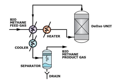 The DeOxo unit is generally followed by a thermal swing adsorption (TSA) gas dryer to remove the water vapour produced by the oxidation reaction. In the case of hydrogen production, the CO2 produced must also be removed. In the case of biomethane for pipeline injection the amount of CO2 produced is not significant enough to require its removal from the product gas.