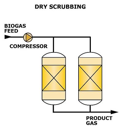 - The process consists in passing the hydrogen sulfide charged biogas through a tower filled with the required amount of active media to ensure the required hydrogen sulfide outlet concentration level as well as the expected life of the media.