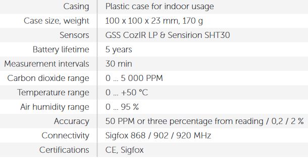 AirWits C02 is equipped with long life battery pack ensuring a 5-year usage and the device works well in high and low temperatures. The transportation costs of Sigfox loT-network are low and together with the long battery usage the lifetime costs are very inexpensive.
