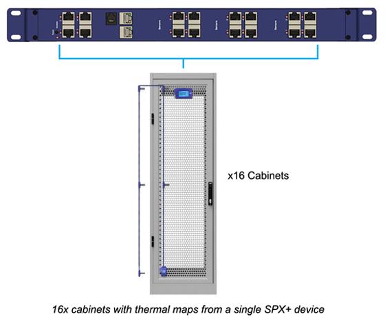 Monitor up to 16 cabinets from a single IP address. With a 16 sensor port SPX+, you consume only 1U of rack space, and save costs by having only one base unit. Thermal map sensors can be extended up to 15 meters from the SPX+.