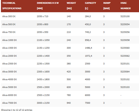 Akva EK: hot water accumulator tank, capacity 300–8,000 litres. The Akva EK hot water accumulator tanks are available in capacities ranging from 300 to 8,000 litres. The pressure rating of the tank is 3 bar. The insulation consists of seamless 100mm polyurethane and a metal casing. The insulation is also available with detachable side sections.