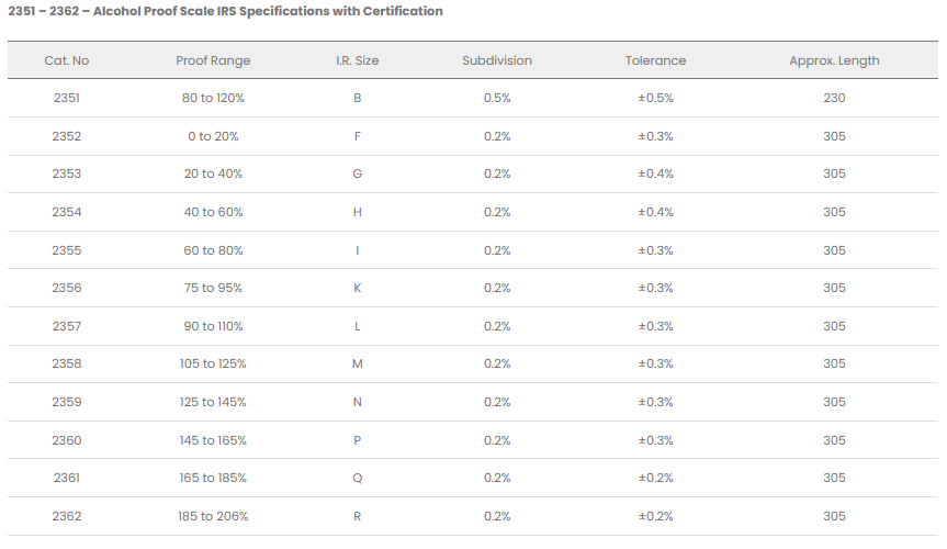 2351 – 2362 – Alcohol Proof Scale IRS Specifications with Certification.