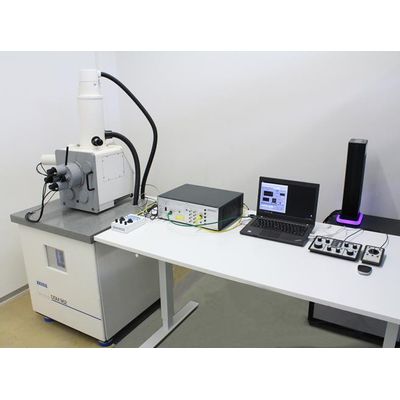 Typical in-situ SEM configuration: the cables from the ASA are routed through a flange to the controller and a laptop PC is provided as well as a SmarAct controller for XYZ displacement.