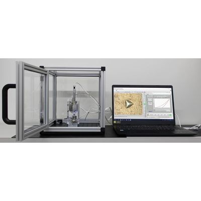 The Alemnis Standard Assembly (ASA) can be used as a standalone micromechanical testing system on any sturdy laboratory bench. For such ex-situ operation, it is recommended to place the ASA in a dedicated enclosure (see Standard Enclosure) and place the enclosure on an anti-vibration table to minimize noise. The ASA can also be mounted under an optical microscope giving a lateral view for experiments in ambient conditions. This configuration is typically used for materials that cannot be tested in the SEM. Many users combine the ASA with an optical microscope which has a long working distance objective in order to facilitate indenter-sample alignment and post-mortem analysis. This also allows a wider range of mounting angles to be used.