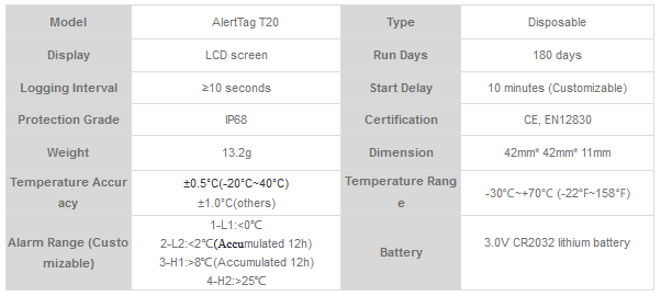 • The AlertTag T20 Disposable Temperature Monitor/Indicator is extremely accurate. With a compact and highly reliable design, the electronic temperature indicator can measure the transport environment of temperature-sensitive products. The humanized and intuitive display can clearly show the alarm status.