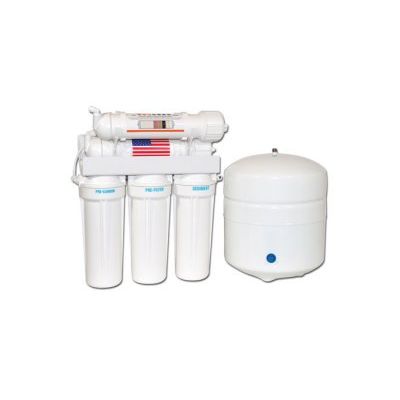 4-stage reverse osmosis (RO) water purification system with 50 GPD membrane, 3 pre-filters (1 - sediment and 2 - carbon block filters). 5th stage pi-alkaline filter raises pH (8-9.5) to alkaline state, puts essential minerals (calcium, magnesium, potassium) back in, creates energized, oxygenated water with a negative ORP. System complete with tubing, shutoff valve, hardware, ceramic disc chrome faucet, tank, instructions. 2-year limited warranty.