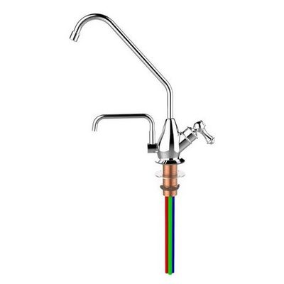 Alkaline water faucet; Pressure open relief design, brass material with long reach spout on top for Alkaline water; Lower swivel spout for Acid water, Four lines of Pre-installed 1/4" OD LLDPE tubing 36" long, Brushed Nickel finish; Green, Blue, Clear and Red color of tube Pre-installed.