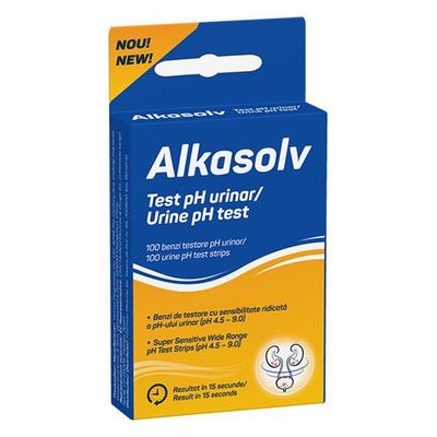 Box with 100 urine pH test strips and indications for interpreting the results.