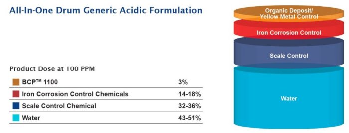 The following graphic represents a generic formulation containing DTEA II™ (BCP™ 1100) and scale and corrosion inhibitors: