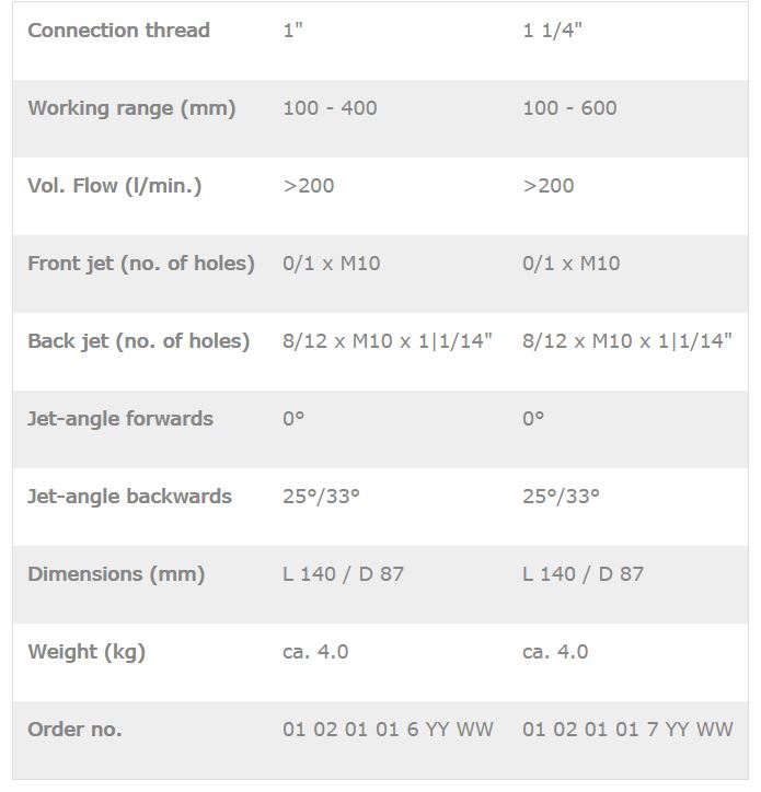 The Dracula is a universal cleaning nozzle with a large jet angle that allows easy cleaning through tight bends. In combination with the High Efficiency Nozzle-Series (designated ‘HW’), use of a mechanical cleaning tool can usually be avoided.