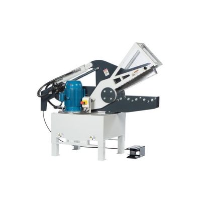 This maintenance and operator friendly shear is equipped with a mechanically adjustable hold-down clamp in combination with a safety guard over the cutting head. The hold down clamp prevents material from kicking back and therefore guarantees operator safety.