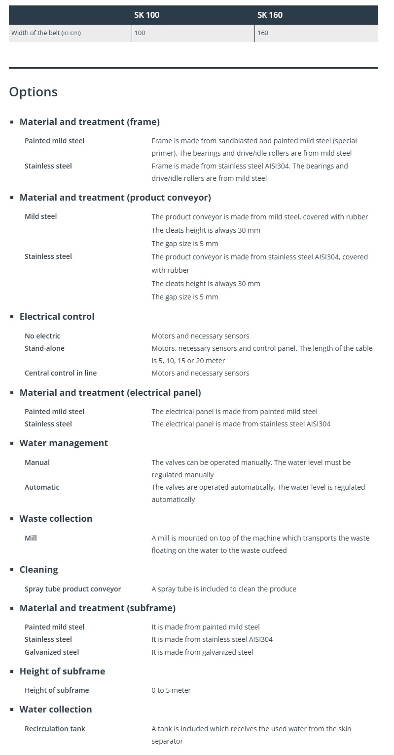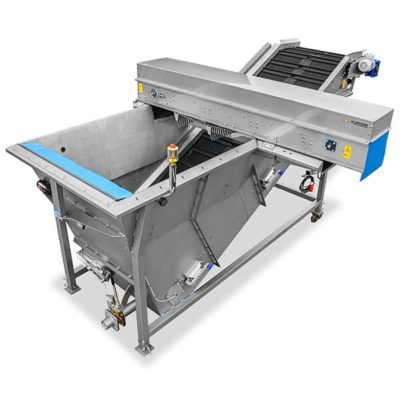 Allround Vegetable Processing manufactures a range of skin separators that effectively remove loose pieces, skin, branches, and leaves from produce prior to the washing process. Allround Vegetable Processing manufactures a range of skin separators that effectively remove loose pieces, skin, branches, and leaves from produce prior to the washing process. The skin separators work on different density principal, that the product is heavier than the pieces that are to be taken out and therefore separates them. A floating waste is carried out from the machine together either with the stream of water or optionally dirt mill can be integrated on top of the skin separator. Optionally a recirculation tank can be included on demand which receives the used water from the skin separator.