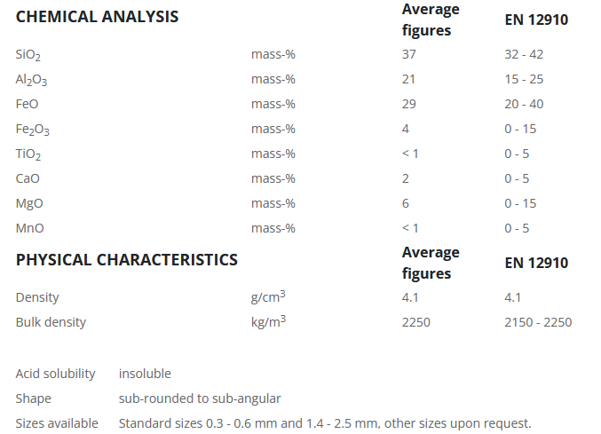 Aqua-garco is a naturally occurring mineral with uniform physical, chemical, hardness and microstructure characteristics, which provide the essential pro­per­ties for a wide variety of industrial uses. Aqua-garco is the compositional variety known as almandite. There are no free elements; all oxides are combined chemically as an iron-rich alumino­silicate, which has the formula: Fe3Al2(SiO4)3. Texturally and compositionally uniform in all sizes. All material mined from the same high-grade deposit.