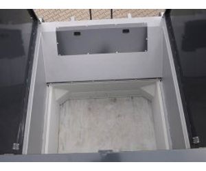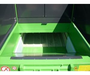 The Alpha-Pack-Bin type APB 616 is a mobile compaction container, which can be transported with the help of roll-off and slip off vehicles. The Bergmann compaction principle compacts cardboard boxes and re-usable materials in an efficient manner. The highest compaction results are thereby achieved through the linear arrangement of the hydraulic cylinders. Unlike the scissor-like arranged cylinders of the APB 616, these are mounted on the exterior to be easily accessible. This eliminates repair work on cylinders or hydraulic hoses from negligent cleaning work. The compacting piston with the APB 616 consists of the main piston and two hinged cover plates. The machine is equipped with a high-powered compacting piston with a deep immersion area in the compaction container.