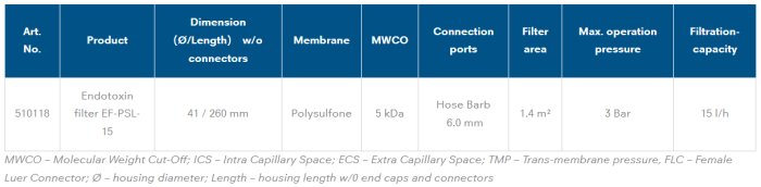 Our hollow fiber filter EF-PSL is the perfect solution for endotoxin applications! This product is single-use and has been integrity tested to ensure it is ready to use. With an effective membrane area of 1.4 m², this filter provides excellent filtration performance.