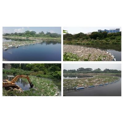 The floating trash barrier is anchored to river bed and secured to the sides. The barrier arrests the trash and this slides to the riverbank. This is a low opex 'fit and forget' solution that brings trash to the riverbank.