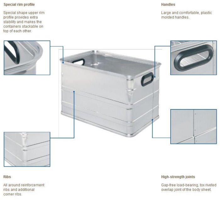 - Practical aluminium container. 0.8 mm aluminium sheet material on all sizes, for targeted use in the food industry.