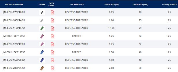 The reverse-threaded couplers are tapered to accommodate a wide range of sizes common in the telecom industry. Each coupler can be used with ducts of the same nominal size, eliminating the need to specify exact outside diameters. The buttressed threads create an excellent mechanical hold. These versatile couplings can be used in manholes, direct bury, aerial, or any application except where an air or water-tight connection is required.