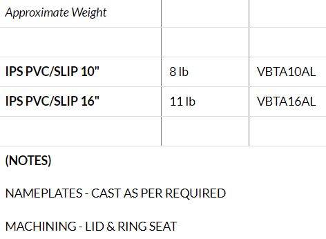Material: Aluminum; Description: Valve Box Top - VBT SLIP AL; Model #: VBTA10AL | VBTA16AL.