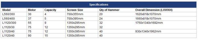 The mills are of exceptionally robust construction with a body in thick mild steel plate. The heavy-duty rotor is fitted with large four-way reversible hammers in tempered steel. The rotor has a large diameter shaft running in special double roller heavy-duty roller bearings.