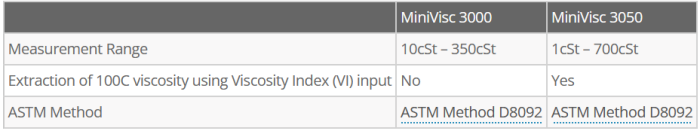 New ASTM D8092 Standard Supports Direct Kinematic Viscosity Measurement. MiniVisc 3000 Series is a temperature controlled, portable kinematic viscometer. The MiniVisc 3000 series (formerly the SpectroVisc Q3000 Series) viscometers are the first truly portable, solvent-free, temperature-controlled kinematic viscometers, providing high-accuracy measurements for easy detection of viscosity variations caused by contamination, mix-up and oil degradation. The devices were designed to determine kinematic viscosity at 40C in the field for applications where immediate results are essential for determining the health of critical equipment.
