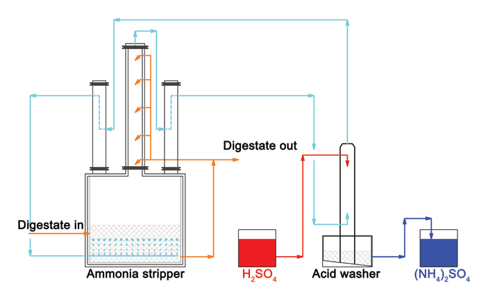 Nitrogen removal from ammonia containing water / sludge / digestate and the production of (artificial) fertiliser. During the fermentation of manure and other organic substrates the organic nitrogen present is largely transformed into ammonia (NH4) nitrogen. The high nitrogen content constitutes a limiting factor for field application of the digestate (as a result of European nitrate directive). Current digestate treatment is making use of biological pathways to convert NH4–N into nitrogen gas. These techniques require considerable amounts of energy and result in the loss of nitrogen as nutrient. The AMFER® technology can be applied to produce ammoniumsulphate, which can be used as an (artificial) fertiliser.