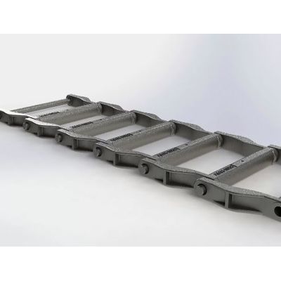 We offer several custom designed chains with various attachments in addition to standard chains such as: HD480 and HD680 drag chain. The chains are available in alloy 8630 QT380-400 material as well as Hadfield Manganese ASTM 128. The chains are assembled using machined 4140 through-hardened pins with riveted construction.