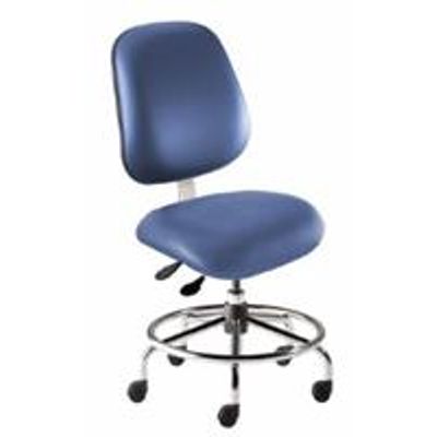 This chair features an ISO 4 clean room performance package and is designed for use at 30"-34" high desktops and benches. Features include a generously proportioned, saddle-shaped contoured seat with waterfall front and internal seat board bumperguard, a roomy backrest with lumbar support and plastic protective panel, and a task control with pneumatic seat height adjustments from 18" to 22", and convenient backrest tilt and height adjustments. The seat and back are covered with Grade 2 black vinyl upholstery. The chair rests on a durable 23” diameter tubular steel base with affixed 21” footring and dual-wheel, non-marring polyurethane casters that resist movement when the chair is unoccupied. Metal parts have chrome finish. Components packaged under laminar flow clean room hood.