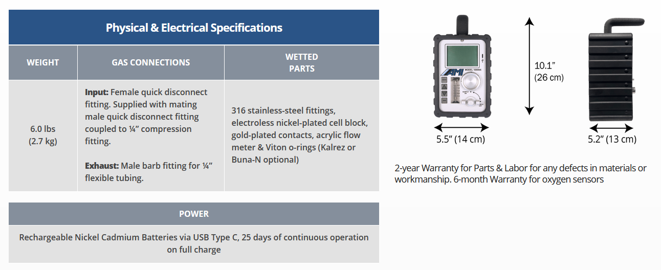 At just 6 pounds (2.7 kg), the MODEL 1000BX is the smallest, lightest, fastest, and most accurate Portable Oxygen Analyzer in the industry. It comes standard with an onboard data logger for measuring time-stamped O2 levels and temperature, which is essential for tracking down hard-to-find, intermittent oxygen leaks in the field. The data log is accessed with AMI’s powerful COMMAND CENTER software which works universally across all AMI analyzers. A long-life rechargeable battery proves invaluable when you need days of unattended operation for tracking sporadic oxygen spikes caused from leaks. The rugged design features a steel case with a protective rubberized outer covering. With all these convenient features in a handheld package, the MODEL 1000BX is the best solution for when you need to take measurements at multiple locations as well as recording measurements over an extended period at a temporary installation.