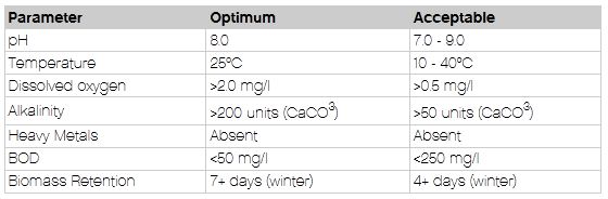 Nitrifying bacteria are very slow growing bacteria which cannot carry out the nitrification process efficiently in the presence of high levels of organic solids. In addition these bacteria also have a requirement for a high level of dissolved oxygen. The product is most effective when the operating conditions in the treatment plant are close to the optimum listed below: