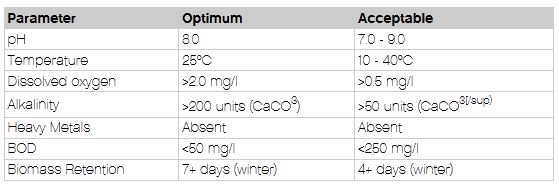 Nitrifying bacteria are very slow growing bacteria which can not carry out the nitrification process efficiently in the presence of high levels of organic solids. In addition these bacteria also have a requirement for a high level of dissolved oxygen. The product is most effective when the operating conditions in the treatment plant are close to the optimum listed below: