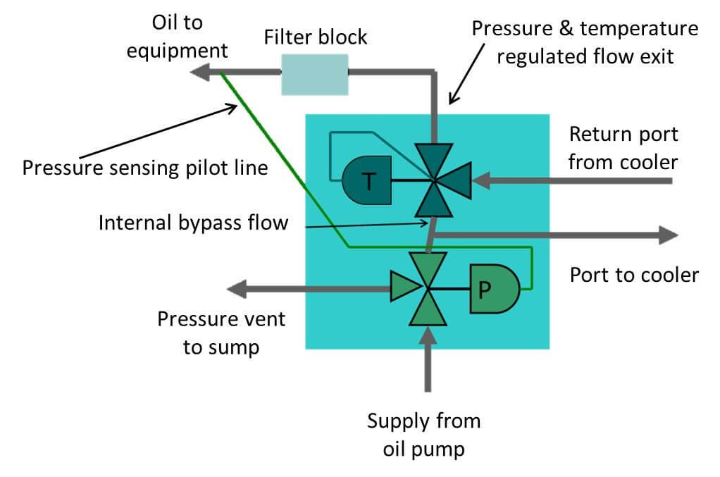 The temperature of the oil is then controlled by the internally sensed 3-way temperature in the valve. The oil flow then split between flowing through a cooler external to the valve and an internal bypass that flows directly to the thermostatic elements. The flow through the internal bypass and cooled oil returning from the cooler are mixed and regulated by the temperature elements to the desired temperature before leaving the valve. The temperature and pressure regulated oil exits the valve and flows through the lube oil system filters before flowing to the equipment requiring lubrication