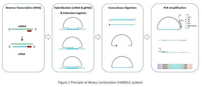 The AmoyDx HANDLEThe test kit is based on Halo-shape ANnealing and Defer-Ligation Enrichment system (HANDLE system) technology which is an improved Molecular Inversion Probe (MIP) technology to capture the target gene region (Figure 1). During the library construction process, each individual DNA molecule is tagged with a unique molecular index (UMI) at both ends, which allows high sensitivity in variant detection by eliminating any library amplification and sequencing bias.