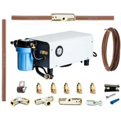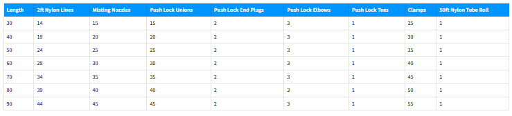All of our mid pressure misting kits come with a 300PSI enclosed misting pump, 50 feet of nylon manifold line, 3 elbows and 1 anchor kit. All other parts will depend on the length and tubing type, see below for specific parts list for our nylon tubing kits.