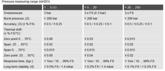 Pressure measuring range: 1 … 250 mH2O. Accuracy: ≤ ± 0.50 / 0.25 / 0.10 % FS. Operating temperature: -5 … 80°C. Process temperature: -5 … 80°C. Output signal: 4 … 20 mA. Materials: Stainless steel, Titanium.