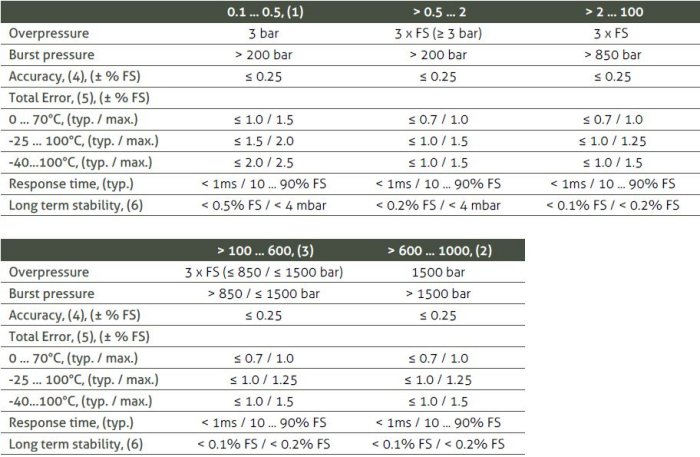 Pressure measuring range: 100 mbar … 1000 bar. Accuracy: ≤ ± 0.2 % FS. Operating temperature: -40 … 125°C. Process temperature: -40 … 150°C. Output signal: 0 … 5 / 0 … 10 VDC, 4 … 20 mA. Total Error Band: ≤ ± 0.30 %FS (0 … 70°C). Process connection: G 1/4 F, 1/4 NPT, 1/2 NPT, G 1/4 M, G1/2 M. Materials: Stainless steel.