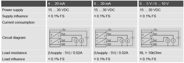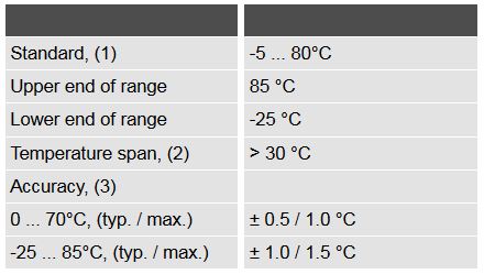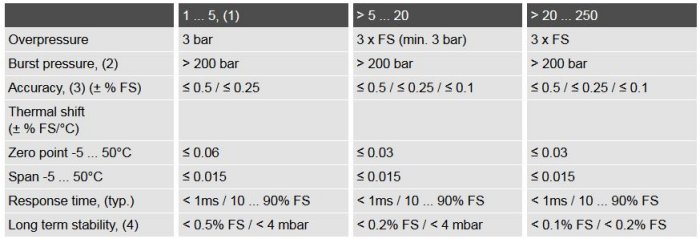 Pressure measuring range: 1 … 250 mH2O. Accuracy: ≤ ± 0.50 / 0.25 / 0.10 % FS. Temperature measuring range: -5 … 80°C. Operating temperature: -5 … 80°C. Process temperature: -5 … 80°C. 2 Output signals (p & T): 0 … 10 VDC, 0 … 20 / 4 … 20 mA. Materials: Stainless steel, Titanium.