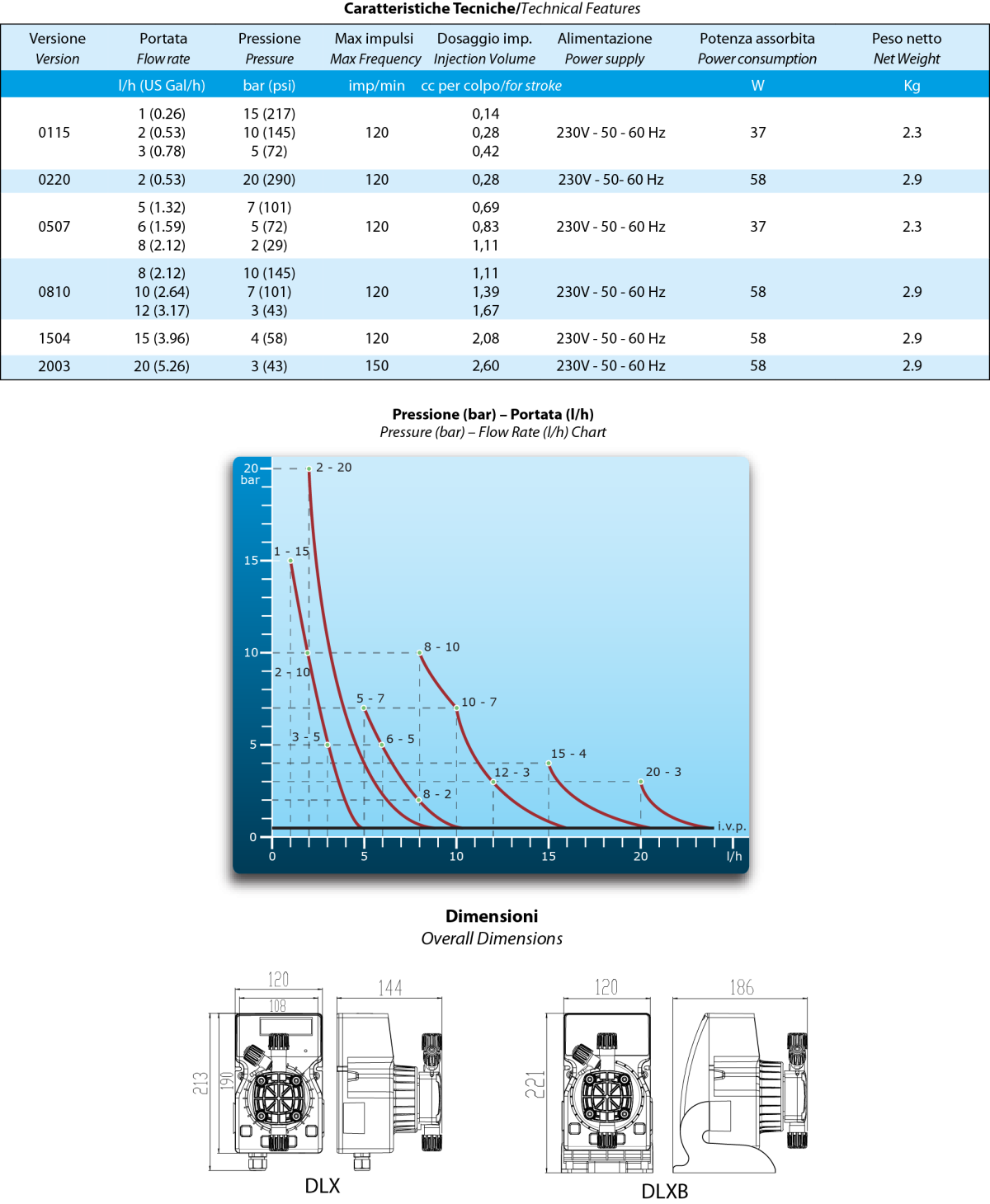Analogue dosing pump with manual ow rate regulation. The high reliability and the price competitiveness make the DLX series the best proposal in dosing systems market. On request, DLXB (foot mounted) series can be supplied with a stroke length control, which enables - by a dial - to adjust the dosing volume between 20-100%. The DLX MA/AD model consists of series of metering pumps enabling manual regulation by knob.