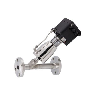 Pneumatic control valve with angle seat design. The angle seat design offers a high flow capacity, the flange connection an easy installation. The integrated digital or analogue positioner is coming along with a very compact design. All wetted parts are made from stainless steel.