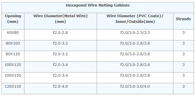 Hexagonal mesh gabions are defined by their mesh size and wire gauge: