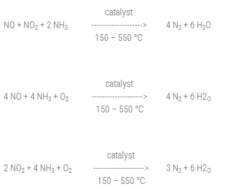 - Diffusion of NO or NO2 from gaseous flow, contact with the adsorbed NH3, reaction and diffusion of the gaseous products to the flue gas flow