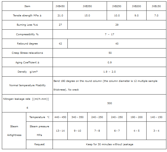 Made of good asbestos fiber rubber with steel wire mesh inserted and compound heating and compression molding it (it can be coated with graphite on the surface one side or two side). Used for the equipment in water,steam,etc.and used as sealing material in the joints of pipeline. Working pressure : 3~14 Mpa, Max working temperature: 150 ~ 450? . This series include: JXB150, JXB200, JXB250, JXB350, JXB450.