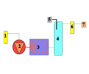 Air from the atmosphere is drawn in to the compressor [2] via a filter [1] and compressed. The compressed air then flows through a heat exchanger [3] to cool before entering the air receiver [4]. The pressure in the tank is measured by sensor [5] and maintained within defined limits. After the tank the air then flows through a filter [6] to remove any dust and bulk water and finally flows to the application via pressure and flow regulators [7].